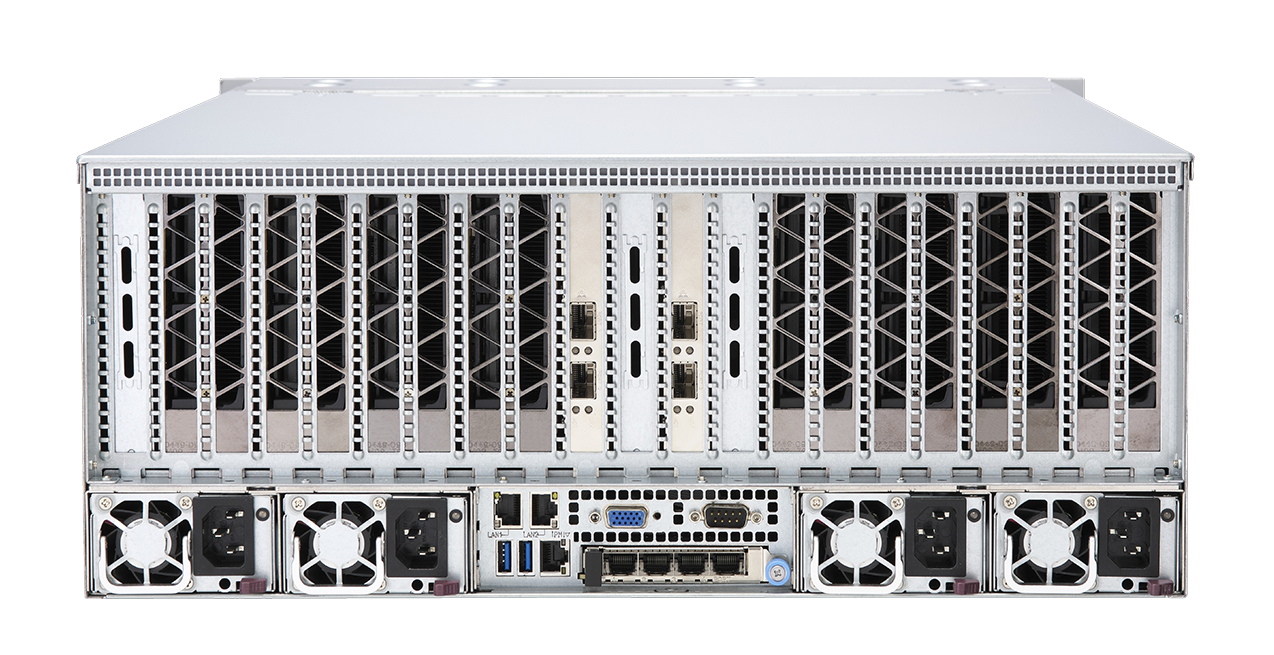 • 配置 10个PCI-E4.0 插槽,提供先进扩展能力,并可搭配 100G 以太网卡和 400G Infiniband 网卡;提供先进 IO 吞吐能力。